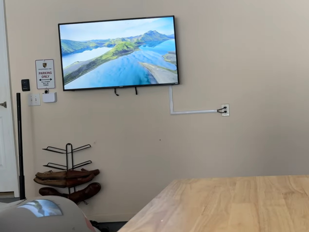 Power and signal wiring in a garage setup cannot hang loosely or run across open wall space. During garage TV installation, cables are routed along protected paths that keep them protected from tools, storage shelves, and vehicle movement. Surface-mounted solutions are commonly used to shield wiring against dust, vibration, and accidental contact.